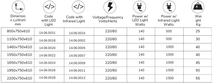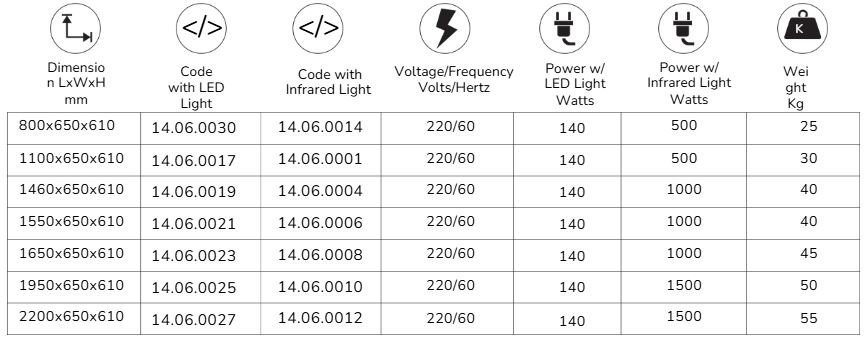 Iron Sneeze Guards have 2 models, one for central use with a coverage depth of 750mm and another for lateral use, with a coverage depth of 650mm. They can be supplied with LED lighting, usually for cold lanes, or with an infrared lamp to help heat up food.
