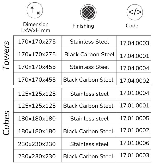 The Iron The Towers and Cubes are produced in steel with black electrostatic painting or in stainless steel with laser cuts and bends for a precise and modern finish.