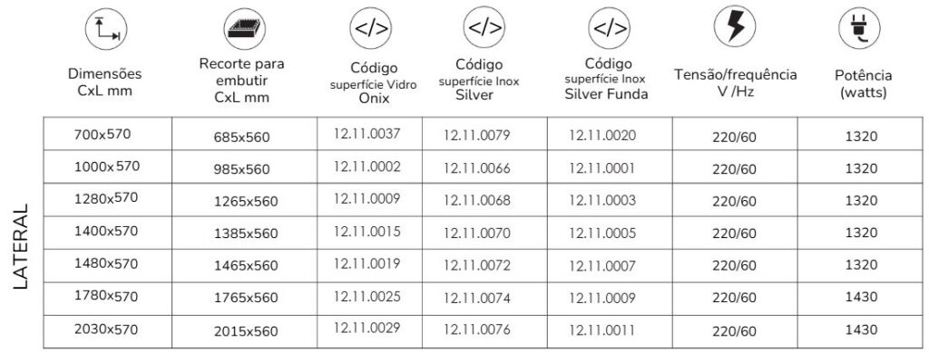 – Modelo Ônix: superfície plana Flat em vidro serigrafado preto temperado.