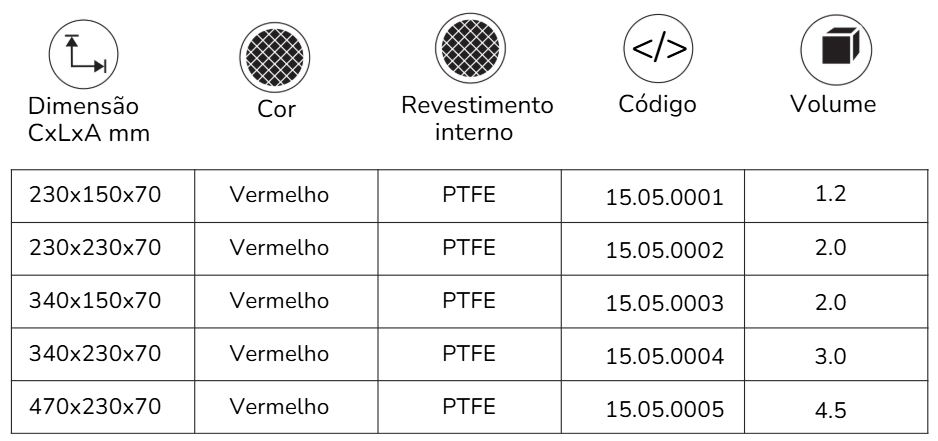 O acabamento é feito em duas etapas, pintura atóxica vermelha na parte externa e revestimento interno de politetrafluoretileno (tipo “Teflon”) para maior praticidade.